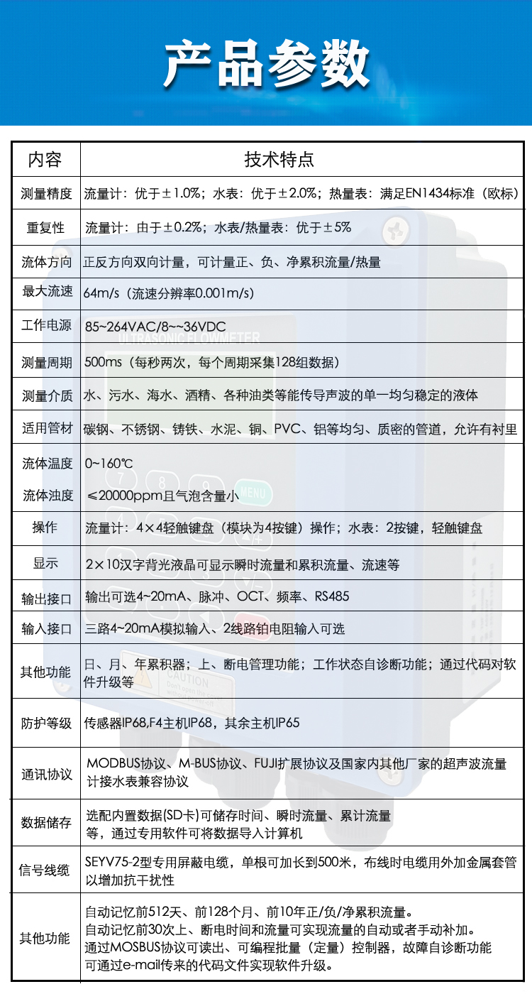 固定壁掛式超聲波流量計利用了低電壓、多脈沖發射接收原理,采用雙平衡信號差分發射、接收專利技術和硬件參數無關化設計方法;通過選用先進的大規模集成電路和SMD貼裝焊接工藝生產而成。靈活多變的中文顯示主機滿足各種不同的工業現場。