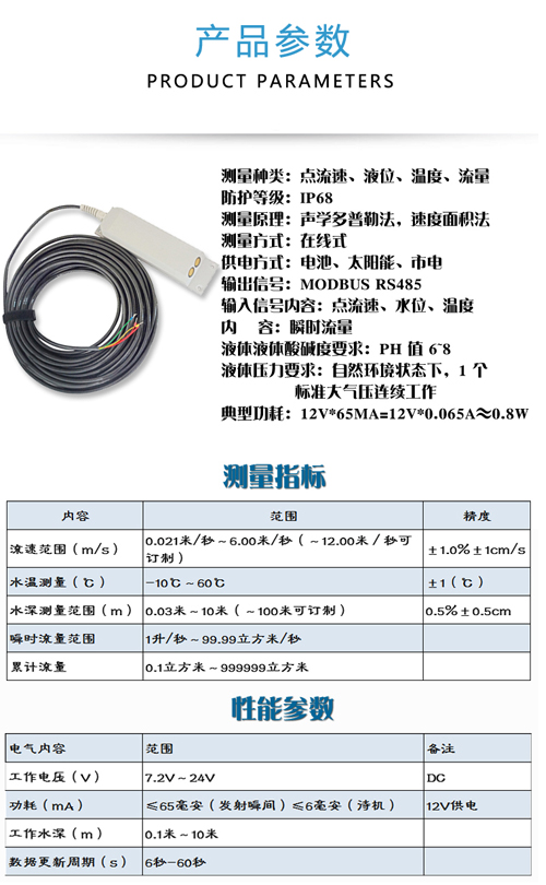 1.產(chǎn)品根據(jù)超聲多普勒效應(yīng)為原理測(cè)量流速,并通過(guò)內(nèi)置壓力傳感器測(cè)量水位及溫度